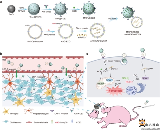 近日,山東大學(xué)齊魯醫(yī)院神經(jīng)外科教授李剛團(tuán)隊(duì)與晶體材料國家重點(diǎn)實(shí)驗(yàn)室教授劉宏團(tuán)隊(duì)在腦膠質(zhì)瘤醫(yī)工交叉治療領(lǐng)域取得新進(jìn)展,該研究通過構(gòu)建基于工程化外泌體負(fù)載磁性納米顆粒的鐵死亡療法,為腦膠質(zhì)瘤的靶向治療提供了新的思路和方法。5月5日,研究成果發(fā)表在國際期刊《先進(jìn)科學(xué)》。