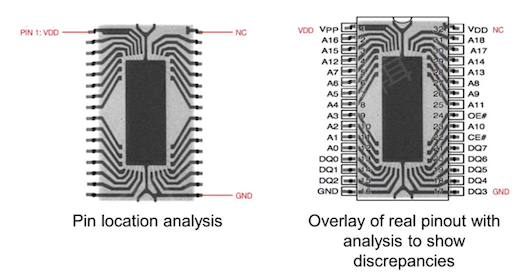 從一個部件的引線框架和引線鍵合圖的布局能夠了解該部件的很多信息。當將引線鍵合圖疊加到X射線圖像時,注意檢查它們是否有所不同。從下圖可以看出VPP和VDD引腳的差異。