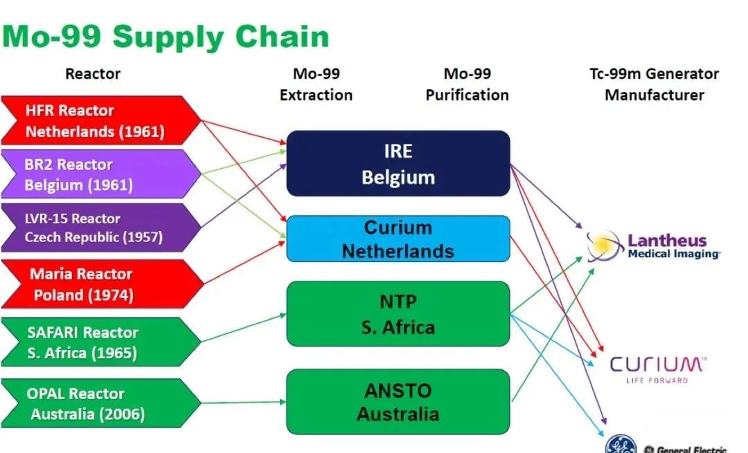 鉬-99的傳統生產方法是在研究堆中對高濃鈾靶件進行輻照,使鈾-235裂變生成鉬-99。目前全球幾乎所有鉬-99均由四家供應商利用分別位于澳大利亞、南非和歐盟的6座研究堆生產。澳大利亞核科學與技術組織一直使用低濃鈾靶件生產鉬-99。在美國的幫助下,南非NTP放射性核素公司2017年成為完成靶件低濃化改造的首家鉬-99生產商,荷蘭Curium公司2018年完成改造,比利時放射性元素研究所的改造工作目前處于最后階段,將于今年完成。因此,從2022年開始,四家主要供應商在生產鉬-99時都將不再需要使用高濃鈾。