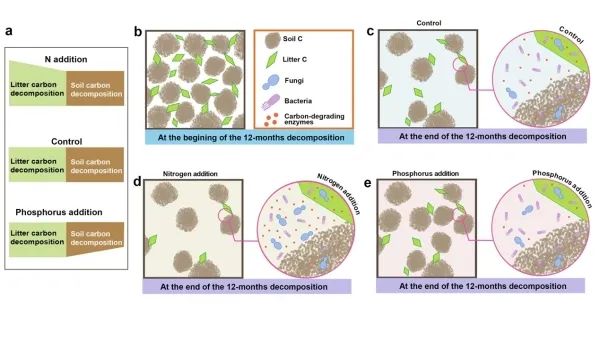 圖1.顯示氮和磷添加如何改變凋落物和土壤碳的釋放及其微生物機(jī)制的概念圖