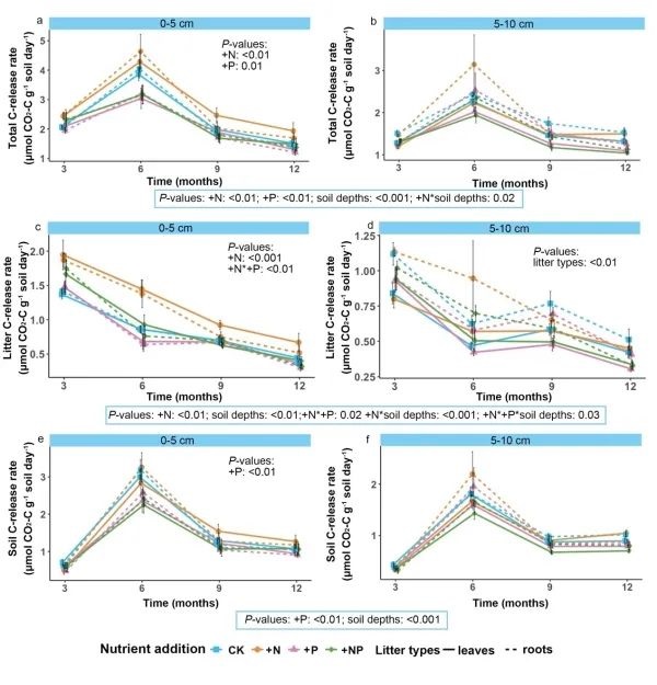 圖2.在華南次生林12個月的土壤分解試驗中,氮磷添加對土壤碳釋放的影響