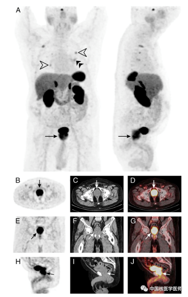 圖 1. 一名79歲的男性患有類癌綜合征并發現雙側肺結節,肺結節活檢證實為分化良好的神經內分泌腫瘤。隨后患者接受了68Ga-DOTATATE PET/CT顯像評估。MIP圖顯示明顯攝取68Ga-DOTATATE的雙側多個肺結節(A,白色箭頭)、左肺門淋巴結(A,雙黑色箭頭)和前列腺(A,黑色箭頭)。前列腺增大,橫斷位測量約大小約為5.1 X 4.1 cm(A,黑色箭頭;B,黑色箭頭;C,白色箭頭;D,白色箭頭;E,黑色箭頭;F,白色箭頭;G,白色箭頭;H,黑色箭頭;I,白色箭頭;J,白色箭頭)。前列腺呈彌漫性攝取68Ga-DOTATATE,經體重校正后的SUVmax為11.5(A,黑色箭頭;B,黑色箭頭;D,白色箭頭;E,黑色箭頭;G,白色箭頭;H,黑色箭頭;J,白色箭頭)。回顧該患者的病史,發現其前列腺特異性抗原水平升高。進一步的前列腺活檢提示為良性前列腺增生,未見前列腺癌細胞。