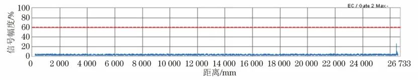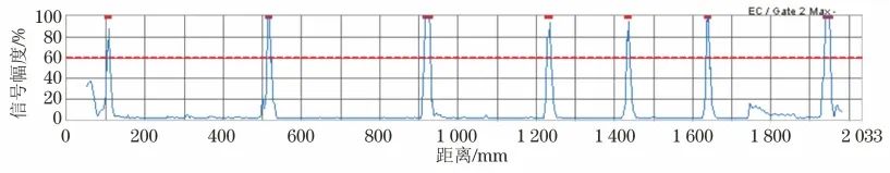 傳熱管在進行直管外渦流檢測時的驗收評定較為簡單,即通過幅值的大小來判定合格與否,只要渦流信號不超過閘門即判定為合格,產品的直管外渦流檢測結果如圖4所示。