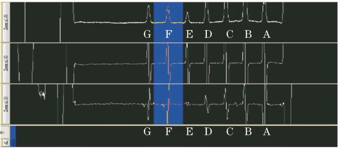 (8)彎管處正切信號是因為彎管壁厚變化而產生,在直管和彎管連接的兩端都產生了較大的水平分量信號。對于記錄彎管處正切信號的管子,可采用目視或者接觸檢測的方法檢查有無異常,并將結果記入電子分析報告。彎管處正切信號如圖18所示。