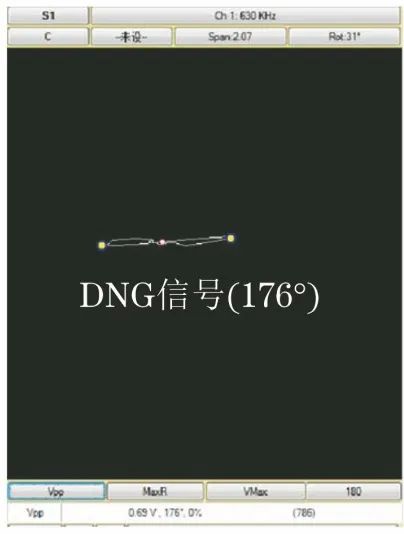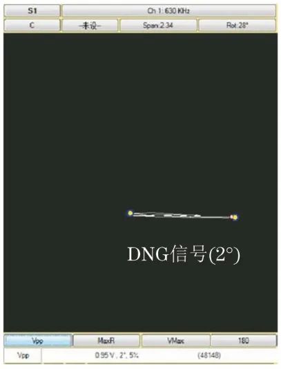 (4)凹痕信號主要是由工件內表面或外表面因軋制或碰撞產生的凹坑引起。通常在主頻率630 kHz差分通道上顯示,信號基本在水平方向,形成8字形信號。內表面凹痕相位在0°附近,深度越大,相位越大;外表面凹痕相位在180°附近,深度越大,相位越小。凹痕信號如圖13和圖14所示。