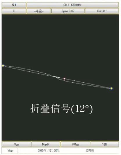 (6)折疊信號一般是軋制時產生的裂紋、扎傷或擦傷在后續的冷軋中被疊壓在鋼管表面上又未熔合成牢固的金屬重疊而引起的。信號為扁平的8字形,通常在1、3、5通道上水平分量較大,相位通常為12°左右,根據折疊深度而略有變化。通常在之前直管內渦流檢測工序時就會發現并去除。折疊信號如圖16所示。