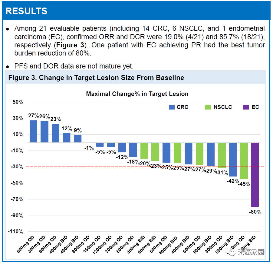 D-1553是由益方生物自主開發的一款新型,高效且口服的KRAS G12C抑制劑。近日,在2022年美國腫瘤研究協會(AACR)年會上,益方生物首次公布了其口服KRAS G12C抑制劑D-1553在癌癥患者中的臨床I期數據,這使得 D-1553成為了首個公布臨床數據的國產KRAS抑制劑。 在一項針對攜帶 KRAS G12C突變的晚期或轉移性實體瘤患者 的國際多中心一期研究中 , D-1553在22例患者中耐受性良好 ,沒有任何劑量限制性毒性。在21例可評估的患者中,觀察到 19.0%確認的腫瘤客觀緩解率 ,達到了 85.7%的疾病控制率 。在劑量水平低至每天300mg時已觀察到腫瘤緩解。