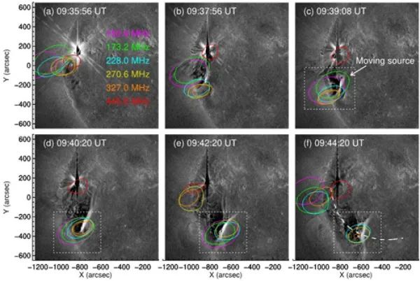圖2.Nancay射電日像儀記錄到的運動射電暴源區位置隨時間的演化,背景為SDO/AIA在193 Å的差分圖像(記錄到一個由活動區向外傳播的亮結構)。