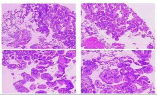 3.左側彩超引導下經皮肺穿刺活檢術后病理結果:組織表面被覆纖毛柱狀上皮,間質可見灶性淋巴細胞浸潤,肺泡腔擴張,內見出血及多量組織細胞浸潤,部分區域伴粘液性變;