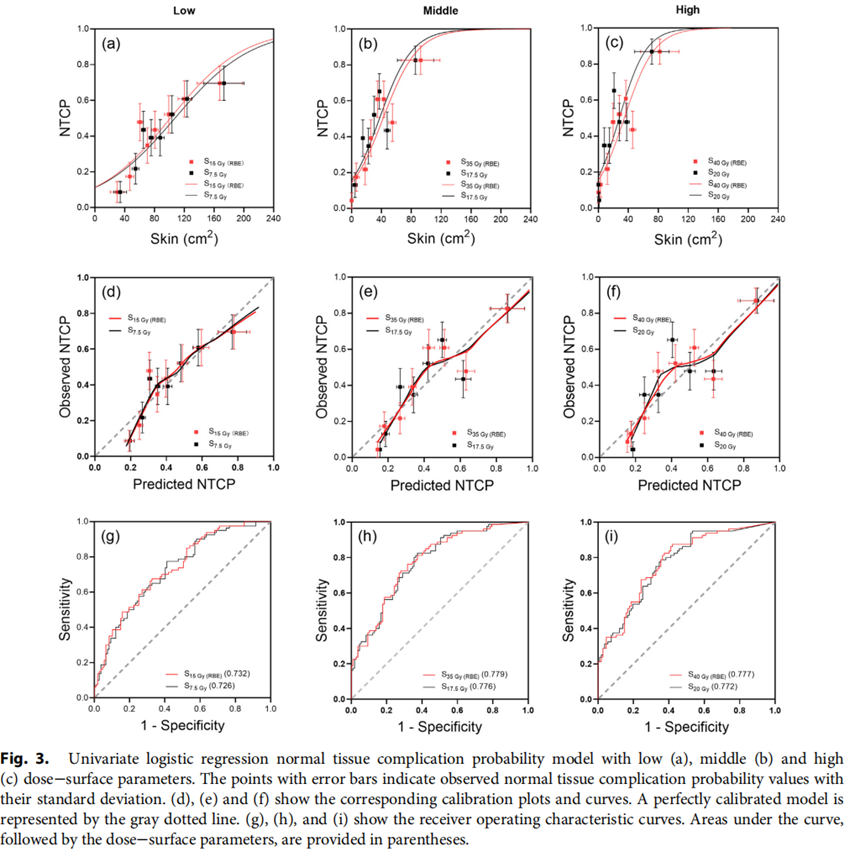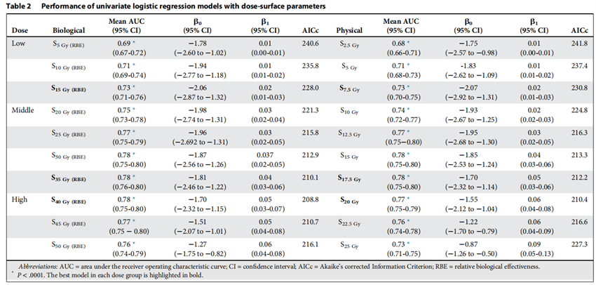 研究人員采用了logistic多因素回歸分析來建立NTCP模型。納入的臨床因素包括年齡、性別、腫瘤體積、分期、手術(shù)、化療、照射技術(shù)等。按照皮膚照射劑量(生物劑量/物理劑量)將患者分為低(5~15 Gy(RBE)/2.5~7.5 Gy)、中(20~35 Gy(RBE)/10~17.5 Gy)、高(40~50 Gy(RBE)/20~25 Gy)三個(gè)劑量組。利用10折交叉驗(yàn)證獲得每個(gè)模型的平均曲線下面積(AUC)值,AUC值越大代表模型分類能力越好,用AICc值判斷模型的預(yù)測(cè)能力,一般其值越低,代表模型預(yù)測(cè)能力越強(qiáng)。最后綜合AUC及AICc值來確定最佳模型。通過上述方法,篩選出每個(gè)劑量組表現(xiàn)最好的NTCP模型。然后通過單因素及多因素回歸分析篩選獨(dú)立的臨床預(yù)測(cè)因素,最后通過Spearman關(guān)聯(lián)分析判斷劑量因素與臨床因素的相關(guān)性,進(jìn)而建立多因素回歸模型。最后,AICc值最低且AUC值最高(如果可以)的模型被確定為最終的NTCP模型。