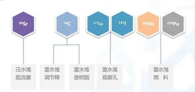 3H、14C、32P、60Co、63Ni、89Sr、99Mo、125/131I、131Ba、153Sm、177Lu等均可通過反應堆輻照生產。