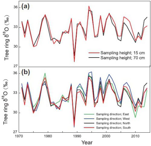 圖1.樹木不同方向、不同高度的氧同位素變化