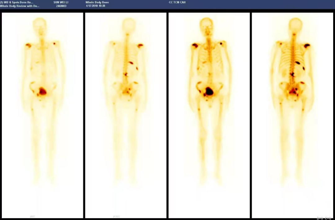李大爺發(fā)現(xiàn)前列腺增生多年,自覺藥物治療不佳,來醫(yī)院泌尿外科就診,完善檢查后診斷為前列腺癌,醫(yī)生建議李大爺來核醫(yī)科做全身骨顯像,經(jīng)核醫(yī)學(xué)科醫(yī)生診斷:前列腺癌全身多發(fā)骨轉(zhuǎn)移。