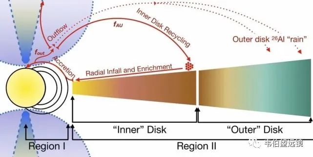 令人興奮的是,今天不同原子的豐度,可以為太陽系在數(shù)十億年前的形成提供線索。自從1976年在阿連德隕石中發(fā)現(xiàn)鋁-26以來,天文學(xué)家們一直在爭論早期太陽系中大量鋁-26的來源。一些人認(rèn)為鋁-26是被超新星爆炸和大質(zhì)量恒星的恒星風(fēng)吹到這里的。然而,這些情景需要很大的機(jī)會(huì):太陽和行星必須形成在離大質(zhì)量恒星恰到好處的距離,這是相當(dāng)罕見的。研究團(tuán)隊(duì)提出了一種不需要外部來源的解釋:提出鋁-26是在其周圍行星形成盤的內(nèi)部靠近年輕太陽形成。