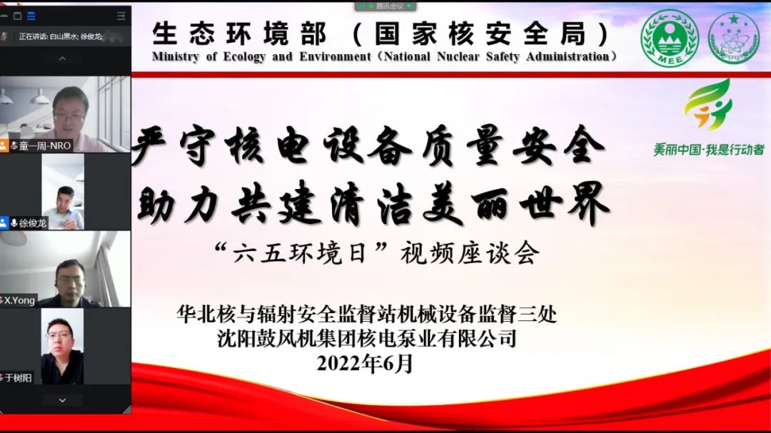 2022年6月5日,生態環境部華北核與輻射安全監督站(以下簡稱華北監督站)機械設備監督三處結合正在開展的CAP1400首臺主泵性能試驗見證檢查,同設備承制單位沈陽鼓風機集團核電泵業有限公司開展了“六五環境日”視頻座談交流活動。