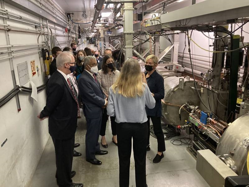 眾議員 Robert C. Scott、D-Newport News、眾議員 Elaine Luria、D-Norfolk 和美國能源部長 Jennifer Granholm 于 2021 年 10 月 25 日在杰斐遜實驗室連續(xù)電子束加速器設施的加速器旁聽取簡報。(戴夫·雷斯)