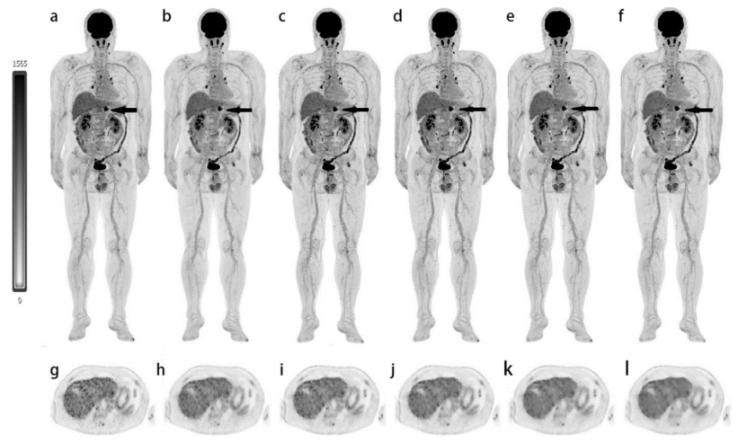 圖1.顯示了使用6種算法重建的患者PET圖像的示例。這是一名62歲胰腺癌患者的MIPs和橫斷位圖像,不同重建算法分別為 OSEM3 (a、g), OSEM2 (b、h), HYPER0.3 (c、i), HYPER0.4 (d、j), HYPER0.5 (e、k), HYPER0.6 (f、l)。黑色箭頭顯示胰腺中的FDG異常高攝取。這6種重建算法的整體圖像得分2、3、3、3、4、4分