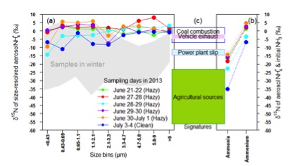 通過對北京2013年初冬(農業(yè)活動減弱)和盛夏(農業(yè)排放增強)大氣霾污染過程不同粒徑段樣品的氮穩(wěn)定同位素測試,研究團隊發(fā)現(xiàn)了“非農業(yè)源”影響城市氣溶膠銨鹽的強烈信號。通過同位素質量平衡模型,解析到北京城區(qū)(年尺度上)銨鹽有55%來自農業(yè)排放,而非農業(yè)源(機動車、燃煤、氨逃逸)的貢獻也決不能忽視(尤其是在重霾污染期間)。同位素源解析結果進一步印證了我國城市觀測到的高濃度氨氣與局地排放有關,而與區(qū)域農業(yè)源的關系不大。如果該結論具有普適性,這將直接關系到我國未來氨氣減排的策略選擇。研究團隊呼吁國內外同行加強合作,進一步開展不同區(qū)域的氨氣/銨鹽濃度和通量測量及來源解析,服務于大氣污染和氣候變化研究。