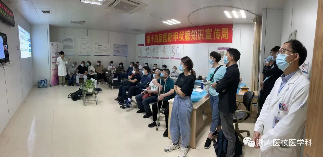 2022年6月13日上午9點浙江省人民醫院在核醫學科候診室舉辦了第十四屆“國際甲狀腺知識宣傳周”活動----甲狀腺相關知識科普宣傳講座。近年來,隨著人們生活節奏的加快,工作緊張度增加,甲狀腺相關疾病的發病率均呈逐年上升趨勢,為了提高全球居民的甲狀腺健康意識,國際甲狀腺聯盟將每年5月25日所在的周確定為國際甲狀腺知識宣傳周(甲狀腺周),該項目也是全球范圍內最大規模的甲狀腺科普宣傳活動。由于疫情原因,核醫學科線下活動在今日上午舉行。