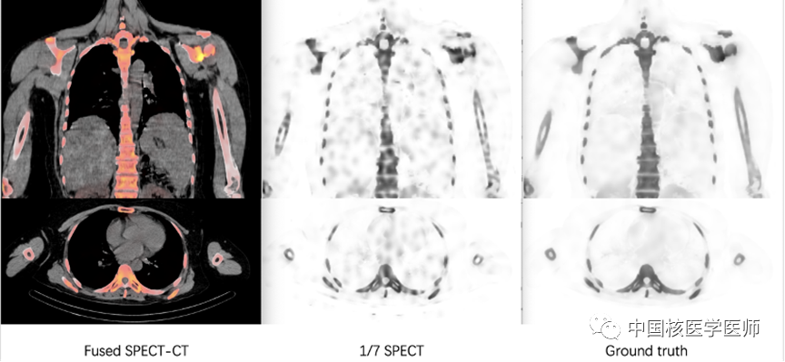 單光子發射計算機斷層掃描(SPECT)與CT檢查(合稱SPECT/CT)結合了SPECT圖像的分子水平功能和CT圖像的精確解剖細節的優勢。其已被證明在骨骼病變診斷中具有強大的功能,被廣泛用于骨腫瘤轉移的檢測。但該檢查面臨檢查時間長,輻射損傷大的問題。先前的研究已提出不少基于硬件改進的方法來提高圖像質量,但往往會增加掃描時間或注射劑量。本研究旨在通過深度學習技術,從算法層面縮短臨床檢查時間,并減少輻射劑量。從SPECT成像技術原理出發,減少輻射劑量和縮短掃描時間具有相同的物理本質,后者同時有助于提高患者在SPECT/CT檢查中的體驗,減少運動偽影。然而,縮短掃描時間也意味著圖像面臨更高的噪聲噪聲水平、更低的圖像質量和并存在失去診斷價值的風險。