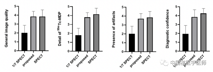 臨床評估:兩位醫師獨立地從總體圖像質量、圖像信號細節、是否存在偽影和總體診斷信心等方面按照五分制方法對1/7 SPECT、合成的SPECT和標準SPECT進行評分(1分代表最糟糕,5分代表最好)。