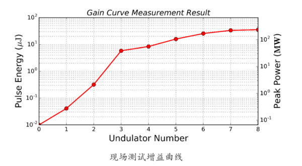 專家組聽取了SXFEL用戶裝置調試情況報告和HLSS模式自由電子激光自測報告,討論確定了測試大綱,并進行了現場測試。測得HLSS模式下的自由電子激光輸出波長為2.96 nm,峰值功率為227 MW,脈沖能量為34.0 μJ,采用反向漸變波蕩器技術(reverse-taper)將輻射脈沖能量增大6.87倍。測試結果表明,上海軟X射線自由電子激光用戶裝置HLSS模式下的自由電子激光性能優于設計指標。