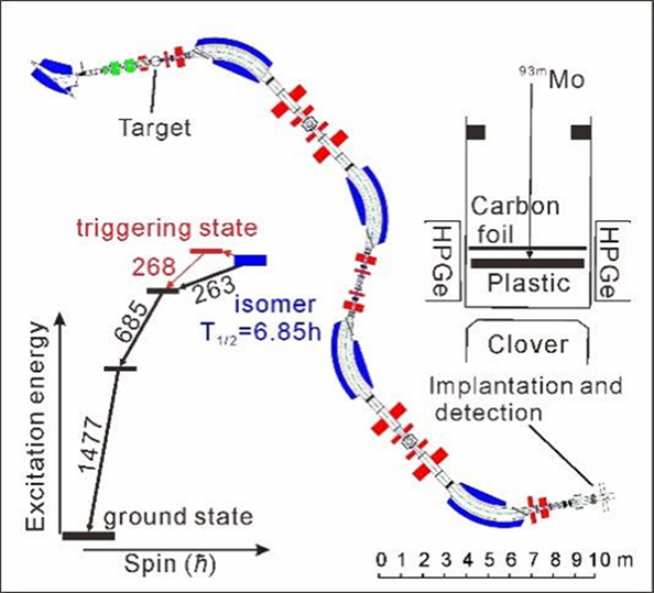 針對此前實驗工作的缺點,近代物理所與合作者設計了全新的實驗方案。實驗中,初級核反應產(chǎn)生93mMo同核異能態(tài),科研人員利用約35米的放射性束流線把93mMo同核異能態(tài)分離、傳輸?shù)降捅镜诇y量區(qū),結合與注入信號的關聯(lián),在很低的本底水平下開展了精確測量。