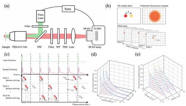 圖1.基于熒光量子相干的超分辨熒光顯微成像方法示意圖。(a)實(shí)驗(yàn)裝置圖;(b)傳統(tǒng)成像方式和SPAD陣列探測方案對比圖;(c)成像過程時(shí)序圖;(d)熒光光子時(shí)空相干性概率分布;(e)引入時(shí)間門調(diào)制后熒光光子時(shí)空相干性概率分布。
