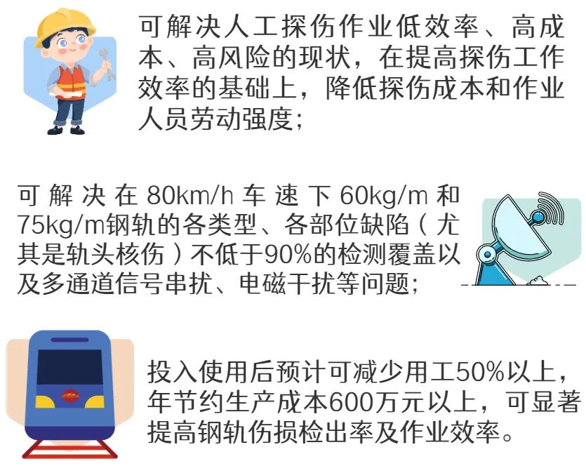 本次鋼軌探傷車上線試驗,將完成不同速度下60kg/m型和75kg/m型鋼軌的數據采集和傷損B型顯示數據分析,并與人工小型探傷儀器數據進行對比。