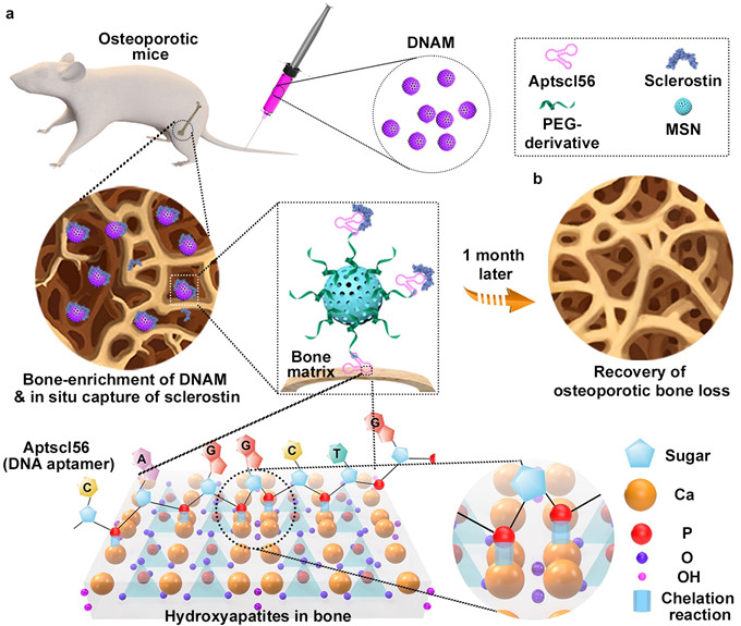 鑒于此,課題組研發(fā)了一種以聚乙二醇(PEG)包被的介孔二氧化硅納米顆粒(MSN)為核心,表面負(fù)載骨硬化蛋白特異性DNA適配體(Aptscl56)的納米藥物(DNAM)。納米顆粒核心起到保護(hù)接枝的Aptscl56免受核酸酶的快速降解和腎臟過濾的作用,延長其體內(nèi)半衰期。DNAM 表面的Aptscl56分子展現(xiàn)了雙重功能。一方面它能夠指導(dǎo)納米藥物骨靶向遞送。這是通過Aptscl56分子中的磷酸基團(tuán)與骨羥基磷灰石中鈣元素之間的相互作用實現(xiàn)的。同時,Aptscl56可以在骨組織內(nèi)高效捕獲周圍的骨硬化蛋白分子,并展現(xiàn)了皮摩爾級別的親和力。