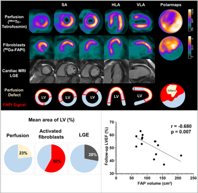 圖:急性前壁心肌梗死的典型病例:使用99mTc-tetrofosmin(第一行)、68Ga-FAPI-46 PET(第二行)、心臟磁共振晚期釓增強(LGE)(第三行)和左心室示意圖(第四行)的心肌灌注圖像。成纖維細胞激活面積超過梗死面積和LGE信號,是最常見的心肌FAP-分布類型左下角:35例患者的平均灌注缺損面積、FAPI信號和LGE。右下角:急性心肌梗死后早期整體心肌FAP容積與慢性期隨訪時左室射血分數(LVEF)呈負相關(n=14)。