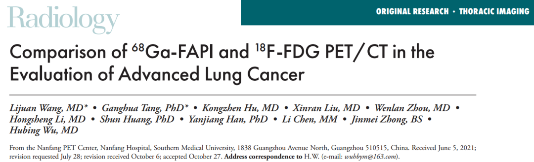 FAP分子探針[68Ga]Ga-FAPI-04對肺癌鑒別診斷也取得重要進展,相關(guān)研究成果以“Comparison of 68Ga-FAPI and 18F-FDG PET/CT in the Evaluation of Advanced Lung Cancer”為題發(fā)表在Radiology(中科院1區(qū),IF = 11.105)。該研究對比分析了68Ga-FAPI和18F-FDG PET/CT在進展期肺癌原發(fā)灶診斷、淋巴結(jié)和遠處轉(zhuǎn)移評估中的價值。結(jié)果顯示68Ga-FAPI PET/CT顯像在肺癌分期中價值明顯優(yōu)于18F-FDG PET/CT顯像,尤其是在檢測腦轉(zhuǎn)移、淋巴結(jié)轉(zhuǎn)移、骨轉(zhuǎn)移和胸膜轉(zhuǎn)移方面,[68Ga]Ga-FAPI-04 PET/CT具有明顯優(yōu)勢。該研究論文是由南方醫(yī)科大學(xué)南方醫(yī)院獨立完成的,第一作者為核醫(yī)學(xué)科王麗娟博士和唐剛?cè)A教授,通訊作者為吳湖炳教授。