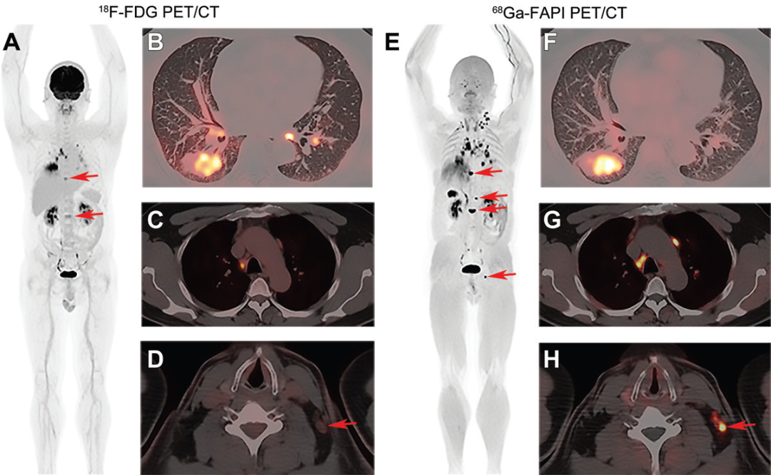 46歲肺腺癌患者,右肺下葉原發(fā)性肺癌(大小:4.9 cm 3 4.2 cm)18F-FDG、68Ga-FAPI均強烈攝取,并觀察到多個小肺在轉(zhuǎn)移;但68Ga-FAPI PET/CT圖像不僅顯示右肺門和縱膈多發(fā)陽性淋巴結(jié)(E, G),而且顯示左下頸部多發(fā)陽性淋巴結(jié)(H,箭頭);MIP圖68Ga-FAPI圖像顯示胸椎、腰椎和左髂骨的4個骨轉(zhuǎn)移灶(E,箭頭),而18F-FDG圖像僅顯示胸椎和腰椎的2個示蹤劑攝取較低的病灶