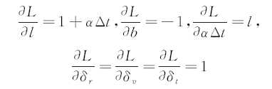 輸出尺寸L是關(guān)于輸入量l,b,lαΔt,δr,δv,δt的函數(shù),且輸入量之間互不相關(guān),根據(jù) GUM(丈量不確定度表示指南)法可得各靈敏系數(shù),即: