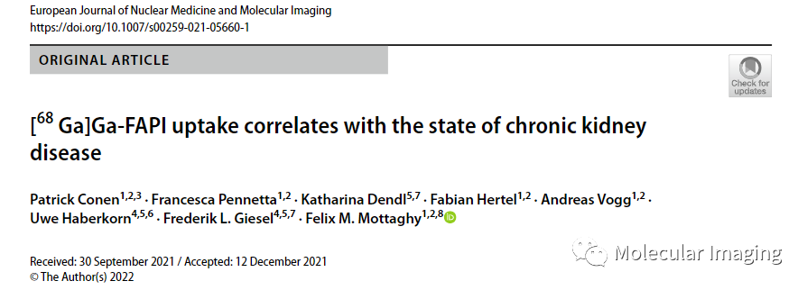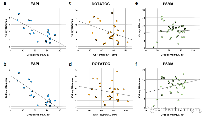 基于以上原理,作者通過回顧性對比分析[68Ga]Ga-FAPI、[68Ga]Ga-DOTATOC和[68Ga]Ga-PSMA在腎實質(zhì)中的結(jié)合與慢性腎病的進(jìn)展階段之間是否存在相關(guān)性,評估核醫(yī)學(xué)分子影像方法在腎纖維化無創(chuàng)檢測中的可行性。