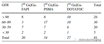 表1 不同放射性示蹤劑組中每個CKD類別的患者總數(shù)