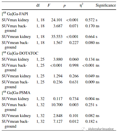 表2 SUVmax和SUVmean評估[68Ga]Ga-FAPI/[68Ga]Ga-DOTATOC/[68Ga]Ga-PSMA ANOVA結(jié)果;s:顯著,ns:不顯著