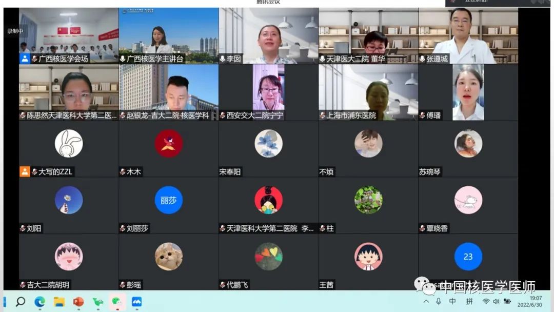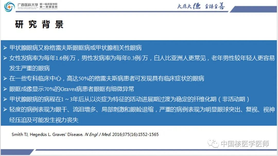 2022年6月30日,由中國醫(yī)師協(xié)會核醫(yī)學(xué)醫(yī)師分會青年委員會舉辦的【文獻導(dǎo)讀】(第六期)活動圓滿完成。本次導(dǎo)讀活動由廣西醫(yī)科大學(xué)第一附屬醫(yī)院和天津醫(yī)科大學(xué)第二醫(yī)院共同承辦,通過騰訊會議采取線下和線上結(jié)合方式開展, 中國醫(yī)師協(xié)會核醫(yī)學(xué)醫(yī)師分會常委兼治療學(xué)組副組長、廣西核醫(yī)學(xué)醫(yī)師分會主委韋智曉教授為活動進行了開場致辭,高度肯定了【文獻導(dǎo)讀】系列學(xué)術(shù)活動的專業(yè)影響力,感謝青委們對活動的積極支持和踴躍參與,期望大家可以通過【文獻導(dǎo)讀】活動取得滿意的學(xué)習(xí)收獲。廣西醫(yī)科大學(xué)第一附屬醫(yī)院李俊紅教授和天津醫(yī)科大學(xué)第二醫(yī)院董華教授共同主持了活動,在第一個文獻導(dǎo)讀的環(huán)節(jié)中,廣西醫(yī)科大學(xué)第一附屬醫(yī)院碩士研究生陽宇華(導(dǎo)師:黃盛才教授)分享了2020年1月發(fā)表在The New England journal of medicine雜志(IF=91.253)上的一項III期隨機臨床對照試驗“Teprotumumab for the Treatment of Active Thyroid Eye Disease”該研究報道了胰島素樣生長因子I受體抑制劑替妥木單抗用于活動性甲狀腺眼病的前瞻性III期多中心隨機臨床對照試驗結(jié)果。廣西醫(yī)科大學(xué)第一附屬醫(yī)院核醫(yī)學(xué)科韋智曉教授和廣西醫(yī)科大學(xué)第一附屬醫(yī)院眼科李凱軍教授對該文獻導(dǎo)讀進行了點評,廣西醫(yī)科大學(xué)第一附屬醫(yī)院李俊紅教授對第一環(huán)節(jié)進行了學(xué)術(shù)總結(jié)。