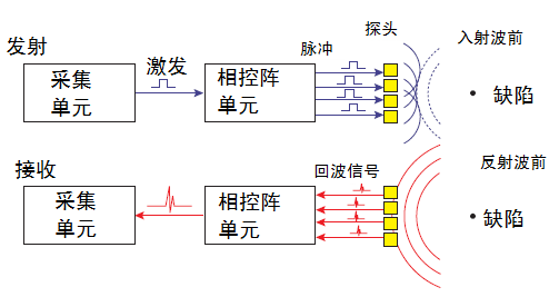 相控陣超聲檢測系統主要由換能器陣列和控制單元組成,換能器陣元按照一定的規則進行排列,具有獨立的收/發控制模塊,當換能器處于發射狀態時,控制單元按照一定的延時規律控制換能器各陣元的發射延時時間,從而控制發射超聲波束的聚焦和指向,實現聲束在一定范圍內的移動、偏轉和聚焦。換能器接收過程同樣遵守上述幾何聚焦延遲規律,與換能器的發射狀態是互逆過程。檢測中,聲束遵循一定的規律在介質中進行傳播,當介質中缺陷處聲阻抗發生變化時,會產生一定聲強的反射信號。該點到達換能器陣列中各陣元的路徑不同,從而導致該點處產生的反射信號到達各陣元時間存在一定的差異。各陣元按照設定的延遲量Δt對回波信號進行延時求和,使來自缺陷的回波信號實現同相,達到增強的目的,實現接收聚焦,相控陣超聲檢測原理如圖3所示。