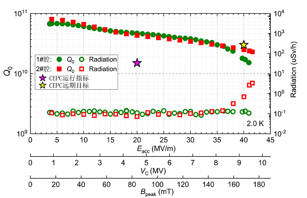 由于體積和表面積大、頻率較低,國內大尺寸(頻率小于1GHz)超導腔的加速梯度一直沒有超過40MV/m,而國際上超過40MV/m的大尺寸超導腔也是屈指可數。因此,在高能所射頻超導與低溫研究中心的部署下,加速器中心高頻組開展了CEPC高性能650 MHz single-cell超導腔的研發,希望可以達到CEPC的遠期目標(3E10@40MV/m)。兩只650 MHz single-cell超導腔的加速梯度均超過了40MV/m,這為下一步繼續提高超導腔的Q值奠定了基礎。