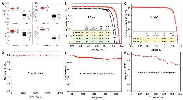 該課題組提出了一種氯元素合金化的真空蒸鍍工藝,用于制備高效率大面積鈣鈦礦太陽(yáng)能電池。通過(guò)該方法制備的太陽(yáng)能電池表現(xiàn)出了優(yōu)異的光電性能,在AM1.5G標(biāo)準(zhǔn)光照下取得了最高24.42%的光電轉(zhuǎn)換效率,刷新了真空蒸鍍法制備鈣鈦礦太陽(yáng)能電池的效率紀(jì)錄,在1cm2和14.4 cm2的大面積器件上分別實(shí)現(xiàn)了23.44%和19.87%的光電轉(zhuǎn)化效率。此外,真空蒸鍍法制備的太陽(yáng)能電池表現(xiàn)出了良好的穩(wěn)定性,在干燥空氣中存儲(chǔ)超過(guò)4000小時(shí)后無(wú)衰減,在濕度為35%的環(huán)境空氣中儲(chǔ)存1300小時(shí)后仍然保持97%的初始效率。該研究結(jié)果展示了真空蒸鍍工藝在制備大面積高效率鈣鈦礦太陽(yáng)能電池的優(yōu)越性和產(chǎn)業(yè)化應(yīng)用的可行性。