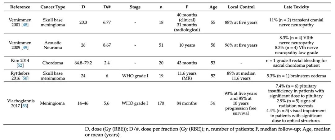 Ryttlefors等人報道了顱內(nèi)良性腦膜瘤使用大分割PT后的長期腫瘤控制結(jié)果。治療方案由每次分割6 Gy (RBE)組成,總劑量為24 Gy (RBE)。19例患者中有17例(89%)經(jīng)歷了腫瘤生長停滯,與接受常規(guī)分割治療的患者相當(vs. 98%)。隊列中的1例患者腦干出現(xiàn)水腫,提示晚期治療引起的毒性。作者認為大分割PT晚期并發(fā)癥的風險似乎與傳統(tǒng)分割相似,但這需要在更大的隊列中進行驗證。