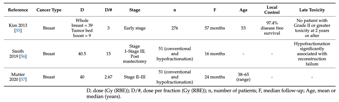 Kim等人報道了一項2期試驗,該試驗以3 Gy (RBE)的日劑量對整個乳房進行加速、大分割全乳照射,然后分3次分割進行9 Gy (RBE)的瘤床推量。該研究包括276例患者(pT1-2和pN0-1a)。中位隨訪時間為57個月,5年局部復(fù)發(fā)率為1.4%,無病生存率為97.4%。隨訪期間未報告3級皮膚毒性。