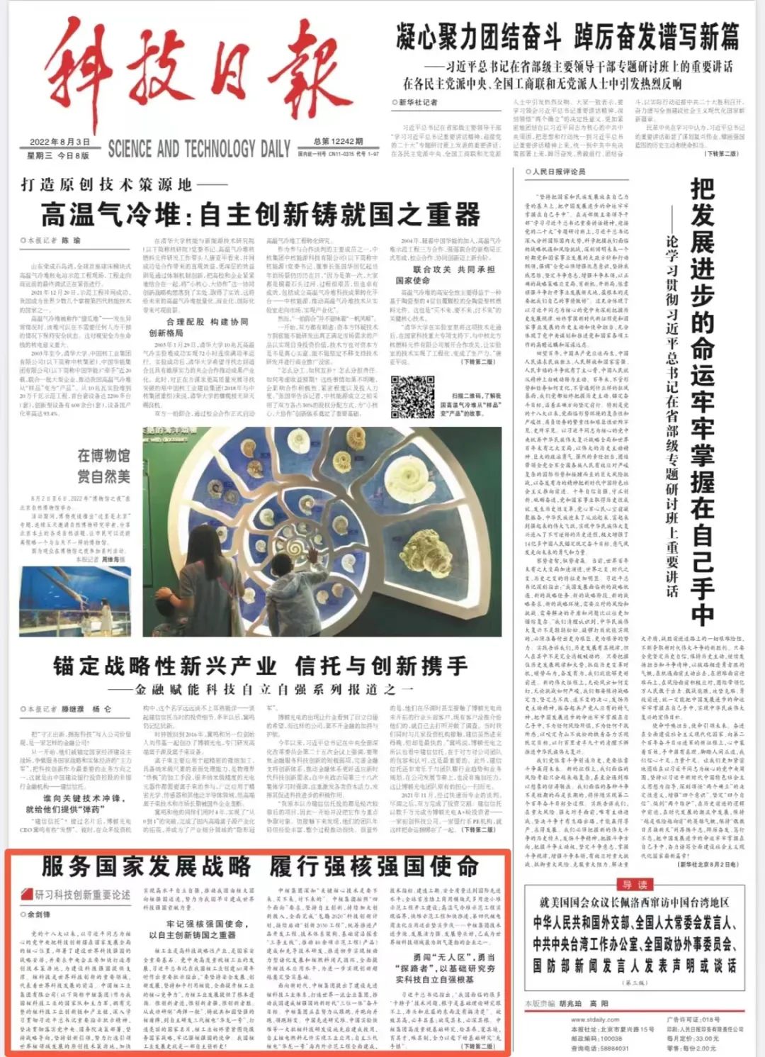 黨的十八大以來(lái),以習(xí)近平同志為核心的黨中央把科技創(chuàng)新擺在國(guó)家發(fā)展全局的核心位置,部署了建設(shè)世界科技強(qiáng)國(guó)的戰(zhàn)略安排,并要求中央企業(yè)要加快打造原創(chuàng)技術(shù)策源地,為建設(shè)科技強(qiáng)國(guó)提供支撐。核科技是世界科技創(chuàng)新的重要領(lǐng)域,代表著世界科技發(fā)展的前沿。中國(guó)核工業(yè)集團(tuán)有限公司(以下簡(jiǎn)稱中核集團(tuán))作為我國(guó)核科技工業(yè)的國(guó)家隊(duì)和主力軍,擁有完整的核科技工業(yè)創(chuàng)新鏈和產(chǎn)業(yè)鏈,深入學(xué)習(xí)貫徹習(xí)近平總書記重要指示批示精神,堅(jiān)決貫徹落實(shí)黨中央、國(guó)務(wù)院決策部署,堅(jiān)持戰(zhàn)略導(dǎo)向,堅(jiān)持創(chuàng)新引領(lǐng),努力打造引領(lǐng)世界核領(lǐng)域發(fā)展的原創(chuàng)技術(shù)策源地,加快實(shí)現(xiàn)高水平自立自強(qiáng),推動(dòng)我國(guó)由核大國(guó)向核強(qiáng)國(guó)邁進(jìn),努力為我國(guó)早日建成世界科技強(qiáng)國(guó)貢獻(xiàn)力量。
