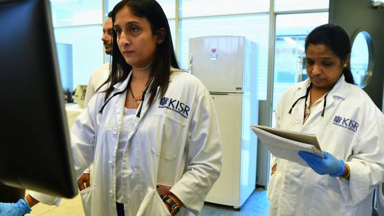 國際原子能機構的一個新研究項目將側重于利用同位素了解對流雨事件對地表和地下水資源的影響。在這里,專家們在科威特科學研究所 (KISR) 分析水樣的實驗室測試結果,2018 年。(照片:D.Calma/IAEA)