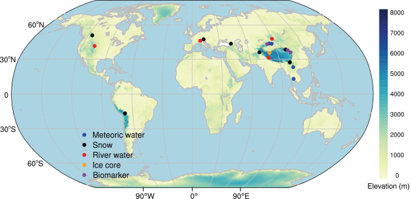 圖1.全球不同地表介質穩定同位素出現“反高程效應”的區域