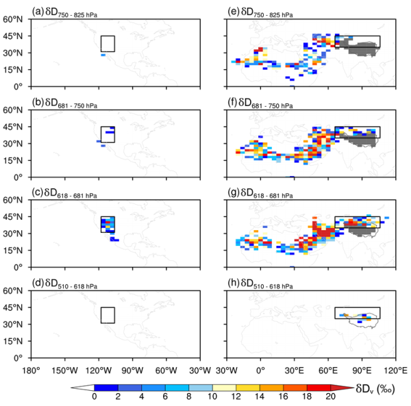 圖2.夏季美國西部和亞洲干旱區不同層水汽穩定同位素出現“反高程效應”的空間分布格局