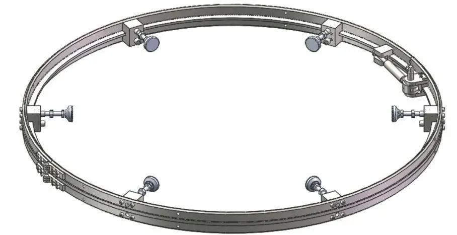 改進(jìn)設(shè)計(jì)采用單軌道夾持,不采用生根裝置。為了保證軌道對(duì)不同管徑的適應(yīng)性和夾持穩(wěn)定性,將軌道分為兩個(gè)系列(ф1300 mm和ф1050 mm),用以覆蓋管徑為ф690~1088 mm的管道。ф1500 mm導(dǎo)軌的外觀(guān)如圖2所示。