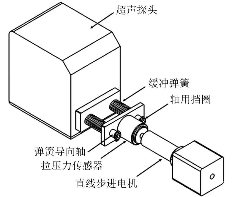 原設(shè)計(jì)為由彈簧直接驅(qū)動(dòng)探頭徑向方向的進(jìn)給運(yùn)動(dòng),當(dāng)主管道處于水平位置時(shí),由于探頭自身重力的存在,探頭施加給被測(cè)管道表面的壓力會(huì)隨著探頭沿焊縫的運(yùn)動(dòng)而發(fā)生變化,該情況勢(shì)必會(huì)對(duì)檢測(cè)精度和準(zhǔn)確性產(chǎn)生一定的影響。國(guó)產(chǎn)化改進(jìn)的探頭進(jìn)給裝置為長(zhǎng)行程恒力進(jìn)給機(jī)構(gòu),如圖4所示,該設(shè)計(jì)很好地解決了上述提到的兩個(gè)問(wèn)題。國(guó)產(chǎn)化改進(jìn)的探頭進(jìn)給裝置由直線(xiàn)步進(jìn)電機(jī)和壓力傳感器組成。直線(xiàn)步進(jìn)電機(jī)通過(guò)電控進(jìn)給來(lái)給探頭施加一定的壓力,再通過(guò)拉壓力傳感器反饋數(shù)據(jù),最后通過(guò)算法來(lái)控制電機(jī)的進(jìn)給量,達(dá)到實(shí)時(shí)調(diào)整壓力的效果,以保證探頭施加給管道表面的壓力為恒定或者僅在某一小范圍內(nèi)波動(dòng)。圖4 長(zhǎng)行程恒力進(jìn)給機(jī)構(gòu)結(jié)構(gòu)示意
