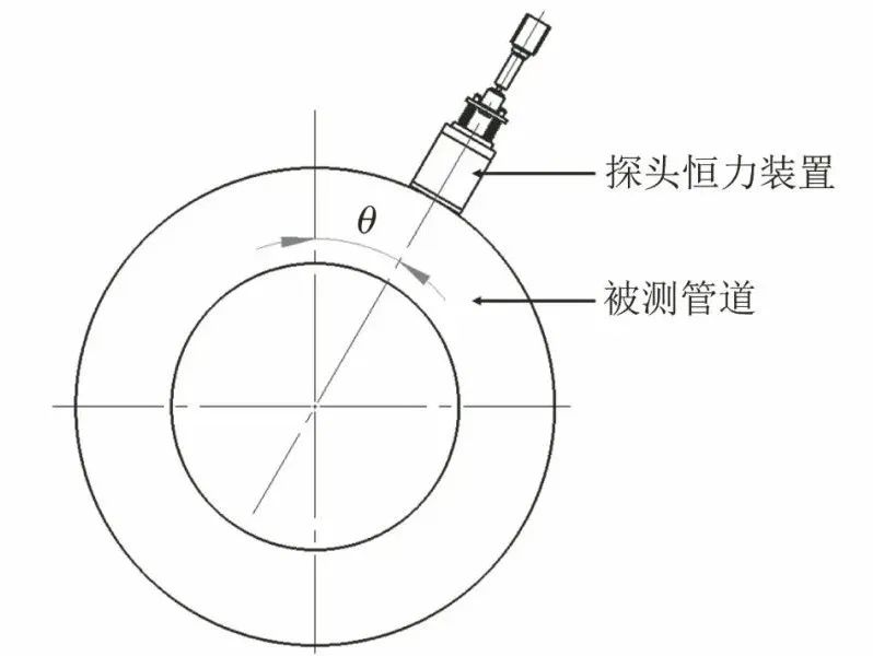 探頭施加在被測(cè)管道表面的壓力F與恒力裝置繞被測(cè)管道圓周運(yùn)動(dòng)的角度θ之間存在一定函數(shù)關(guān)系(設(shè)探頭重力為G,拉壓力傳感器示數(shù)為F1)。函數(shù)關(guān)系如下所述:
